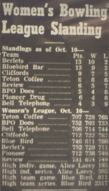 The lanes may not have been operating continuously through the duration of WW II, investigate. Charlie Drake and Shorty Pollock purchases the lanes from Henry Fields and took possession February 15, 1950. Reference to new management Mr. and Mrs. William Emmons and Mr. and Mrs. Verne Lucus in September 1950. C A Brown was the owner/manager of the alleys per the 1953-54 & 1955 Rocky Mountain Business Directories. |