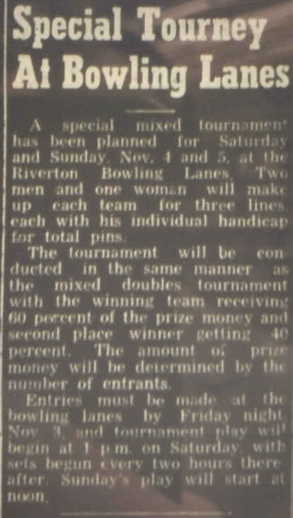 | Names: | Riverton Recreation Parlor (193? - 194?) Riverton Bowling Alleys (194? - Sept 9, 1950) Riverton Bowling Lanes (Sept 9, 1950 - 195?) Browns Bowling Alley (195? - 195?) Riverton Bowling Lanes (195? - 1958) |