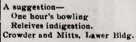 They ordered two bowling alleys, billiard, pool and card tables along with tobaccos and confectionery and the amusement place was operational by March 1917. In October 1917, Mr. Crowder dissolves the partnership and Mr. Mitts continues running the alleys. In April 1919, Walter Mitts starts a free employment service in the bowling alley (which appear to be dead). In July 1919, William Mitts is charged with conducting a gambling game, along with Fred Benson, in the H C Lawer building and both plead guilty. H C Lawer is also charged as proprietor of the building and pleads not guilty. Based on Riverton's Occupation Tax meetings during September 1919 I believe this location might have installed boxball alleys. In June 1921, Walter Mitts and H C Lawer were in Judge Brown's court in Lander for bootlegging and the place of business was ordered to close for a period of one year. In December 1921, Chas. Slater purchased the pool hall and bowling alley equipment belonging to Walter Mitts and opened the business after Judge Brown received an application to approve the sale. No mention of bowling after 1921 in the Riverton newspapers. |