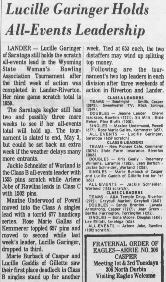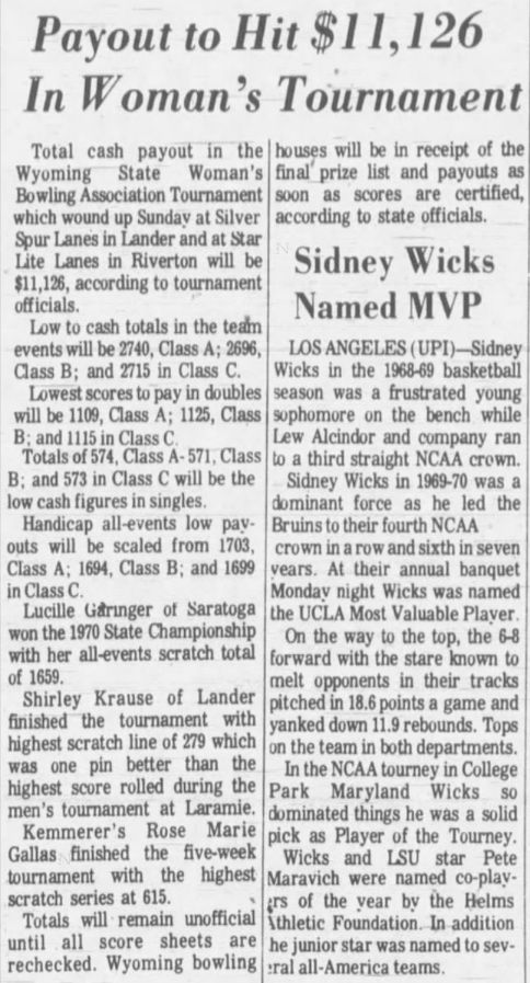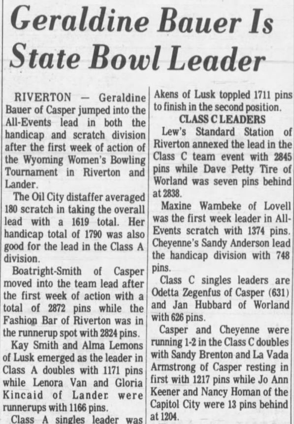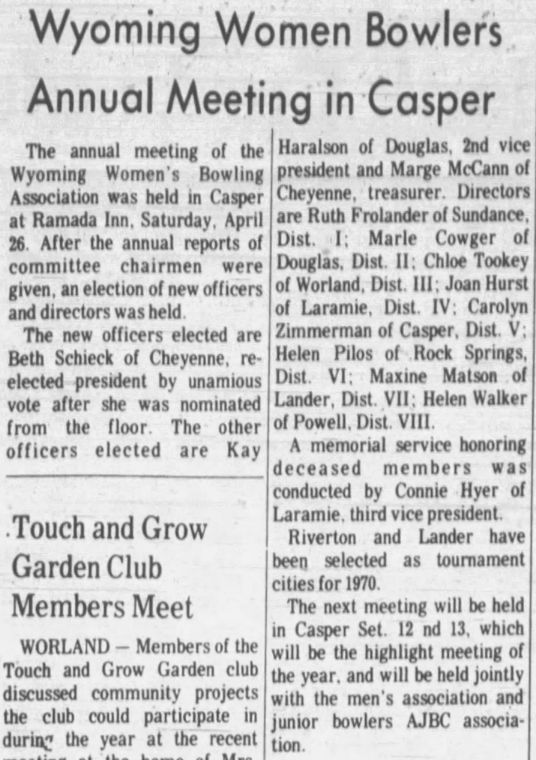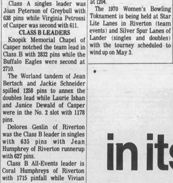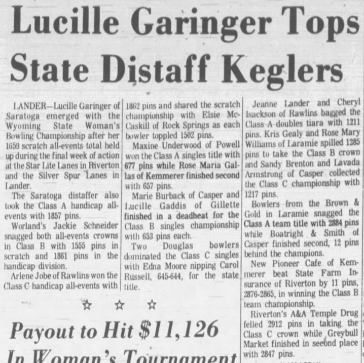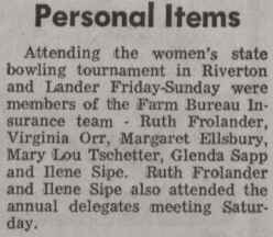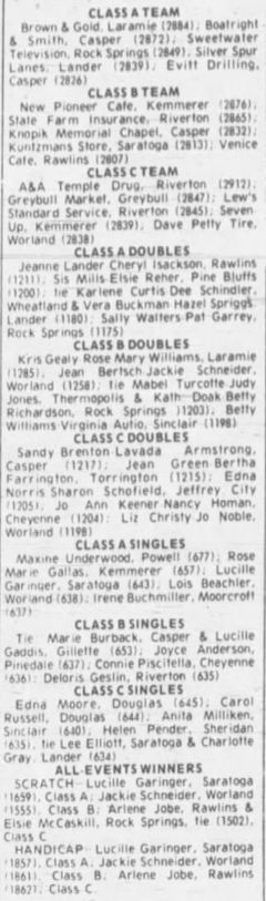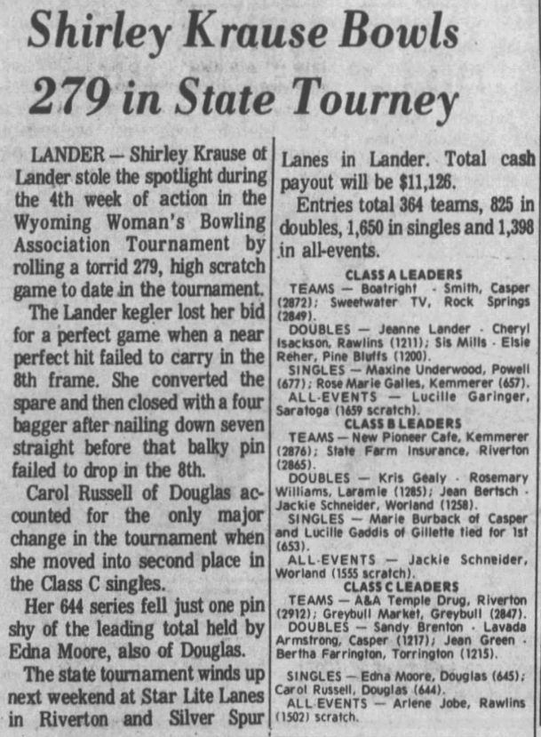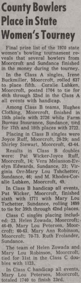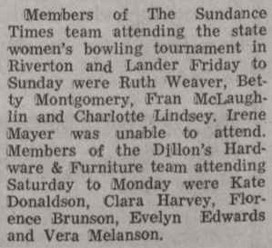 Reference to Kenneth C Hubbard as owner per the 1962 Rocky Mountain City Directory for Riverton. Reference to Paul Corey and Reno Long as partners per the 1968 Rocky Mountain City Directory for Riverton. Paul F Corey (with wife Joann) was also involved with the West Drive-In Theater in 1968. In 1970, the 25th Annual Wyoming Women's State Bowling Tournament held the Team Event here in conjunction with the Doubles & Singles Event at Silver Spur Lanes in Lander, WY. Gordon Fitzgerald was the manager per the 1971 Johnson Publishing Company Riverton City Directory. L E Vandenbrook was the manager per the 1972, 1973 & 1975 Johnson Publishing Company Riverton City Directories. Reno Long, who managed the Star Lite Lounge in the beginning, was the owner/manager per the 1976 Johnson Publishing Company Riverton City Directories. Larry McIntosh and Loren Miller were the owners/managers per the 1979 & 1980 Johnson Yellow Pages Phone Books. Larry McIntosh and Peter Zanetti were the owners/managers per the 1982 & 1983 Johnson Yellow Pages Phone Books. Reno and Eveyln Long were the co-owners per the 1984, 1985 & 1986 Johnson Yellow Pages Phone Books. In 1985, the 37th Annual Wyoming Men's State Bowling Tournament held the Team Event here in conjunction with the Doubles & Singles Event at Valley View Lanes. In 1989, the 44th Annual Wyoming Women's State Bowling Tournament held the Team Event here in conjunction with the Doubles & Singles Event at Valley View Lanes. In 1994, the 46th Annual Wyoming Men's State Bowling Tournament held the Doubles & Singles Event here in conjunction with the Team Event at Silver Spur Lanes in Lander, WY. In 1999, the 54th Annual Wyoming Women's State Bowling Tournament held the Team Event here in conjunction with the Doubles & Singles Event at Silver Spur Lanes in Lander, WY. |